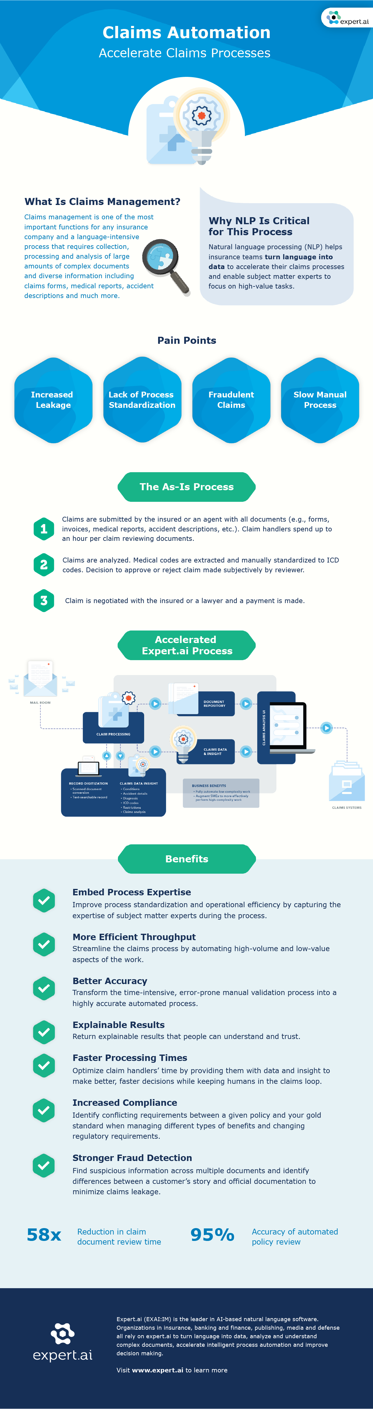 Expert.ai insurance solutions can read, understand, and extract essential data from medical and accident reports, submissions, score risk engineering reports and triage claims based on urgency and severity, classify records by type, and generate summaries.