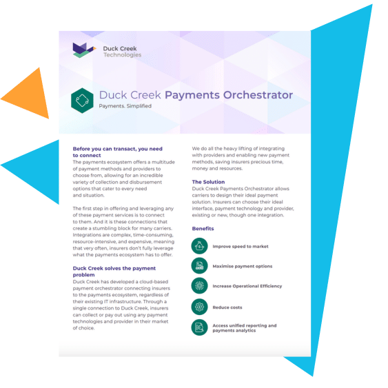Download our data sheet to learn how Duck Creek Payments Orchestrator eliminates these barriers by providing a single, streamlined connection to a wide array of payment technologies and providers worldwide. Whether for collections or payouts, insurers can seamlessly access global payment networks, regardless of their current IT infrastructure.
