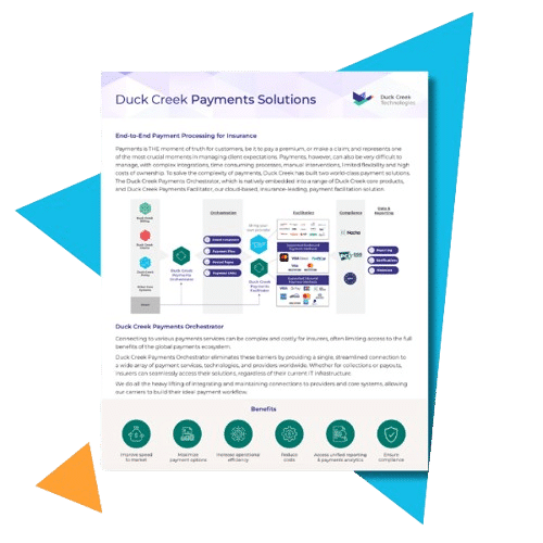 To solve the complexity of payments, Duck Creek has built two world-class payment solutions: The Duck Creek Payments Orchestrator, which is natively embedded into a range of Duck Creek core products, and Duck Creek Payments Facilitator, our cloud-based, insurance-leading, payment facilitation solution. Learn how our modern, insurance-focused payment solutions can help you transform your operations.