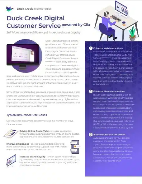 With Duck Creek Digital Customer Service powered by Glia, insurers can leverage real-time chat, cobrowsing, screensharing, voice, video, and AI-powered bots to seamlessly deliver a complete set of modern, digital-first customer experiences to better serve your producers and customers.