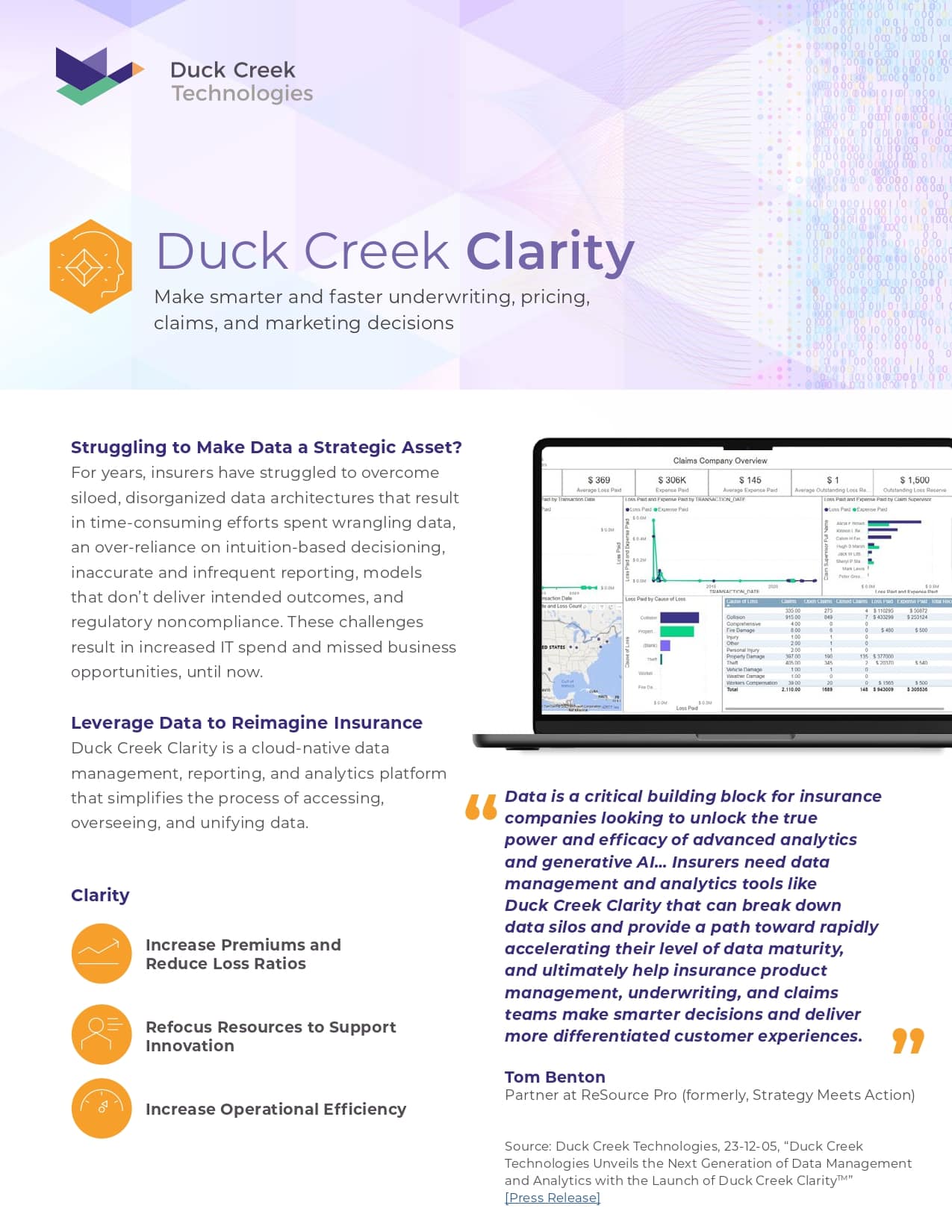 Duck Creek Clarity enables insurers to use data as a strategic asset in real time, empowering them to nimbly adapt core applications, capture and leverage data across and beyond their organizations, deliver leaders and business users crucial information needed to execute intelligent actions, and employ new methods of automated decisioning (such as AI and advanced analytics).