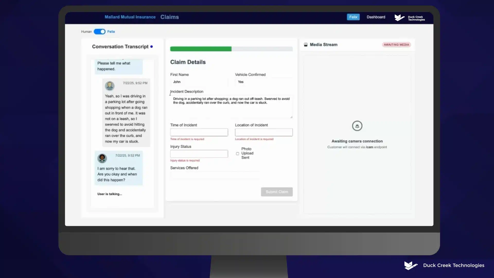 Together the “Featherweights” team innovated and created “Felix,” a real-time, multi-modal, multi-agent AI for automated First Notice of Loss (FNOL) to transform claims operations, reduce costs, and drive revenue growth. As policyholders interact with Felix, to report losses or incidents and upload pictures and videos, Felix coordinates AI agents to intake and triage FNOL. The result helps P&C carriers address common industry challenges: